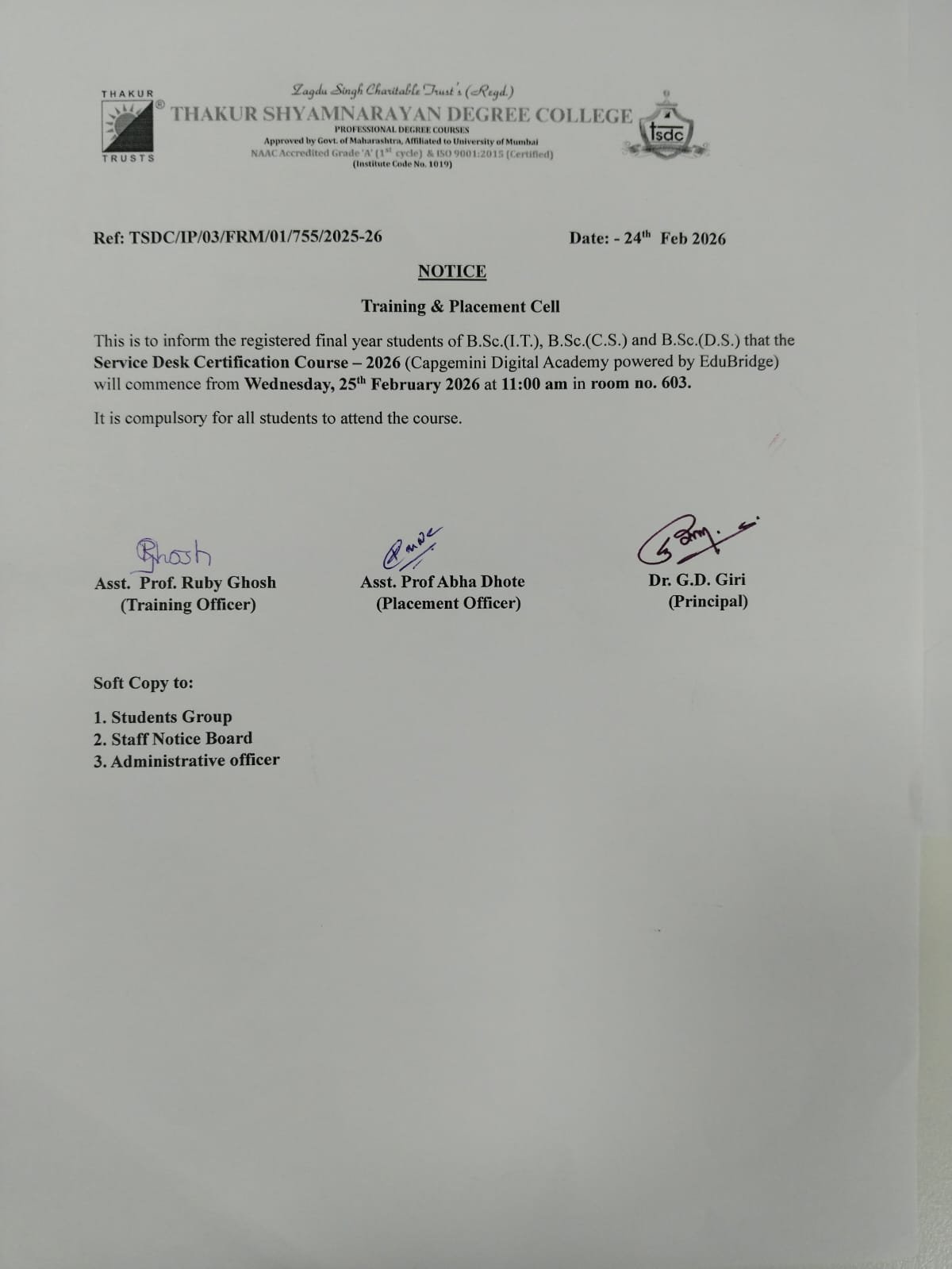 Notice regarding Final Year registered students of TYBSc(IT), TYBSc(CS) & TYBSc(DS) for Service Desk Certification Course February 2026.