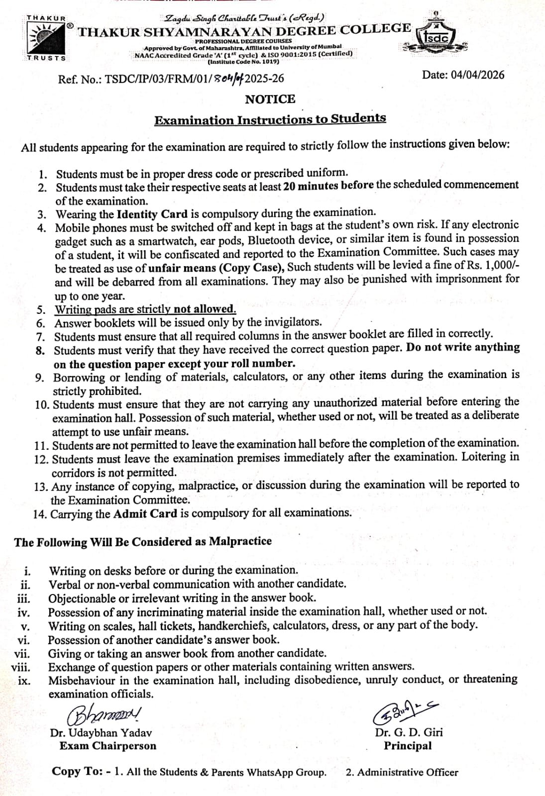 All students appearing for the upcoming examinations are required to strictly follow the prescribed examination instructions and guidelines.
